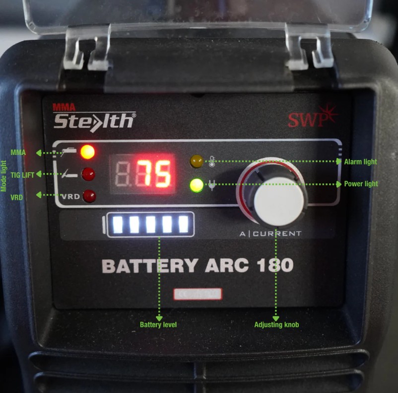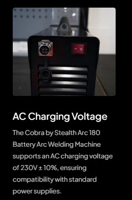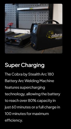 The Cobra by Stealth arc 180 welding machine comes complete with earth cable, electrode holder and super fast battery charger, allowing for quick and efficient charging.