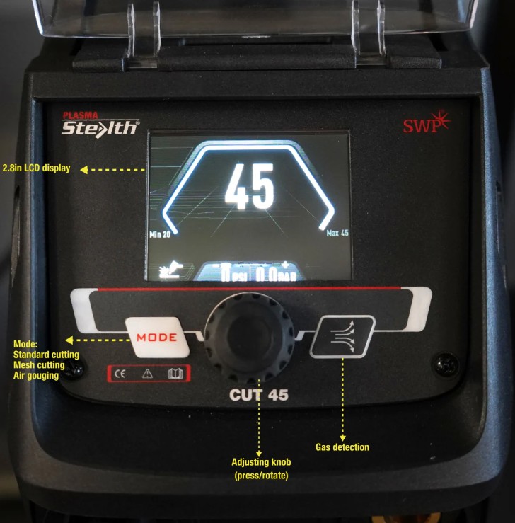 LCD screen The Cobra by Stealth Cut 45 PFC LCD Plasma Cutting Machine is equipped with an LCD screen, providing precise control over settings and real-time feedback on cutting output, ensuring accuracy and ease of operation.
