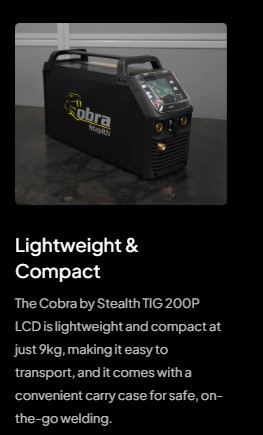 Electronic HF TIG arc ignition system The Cobra by Stealth TIG 200P LCD is equipped with an electronic HF TIG arc ignition system, ensuring contamination-free, easy arc starts with minimal EMF interference.