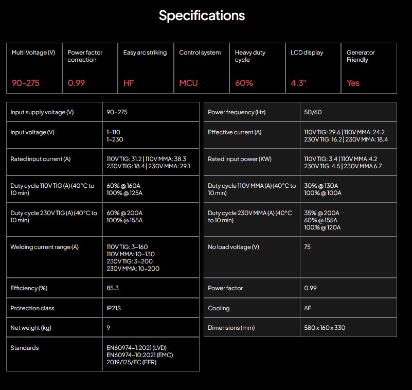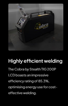 PFC Technology: Power factor more than 0.99 The Cobra by Stealth TIG 200P LCD is equipped with advanced PFC (Power Factor Correction) technology, achieving a power factor of over 0.99 for optimized energy efficiency and reduced power consumption.