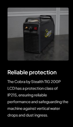 Temperature, voltage and current sensors The Cobra by Stealth TIG 200P LCD is equipped with temperature, voltage, and current sensors, offering high protection to ensure safe and reliable performance during welding operations.
