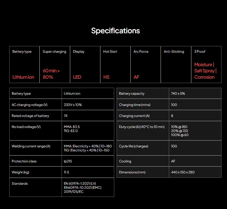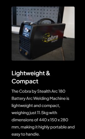The Cobra by Stealth arc 180 welding machine comes complete with earth cable, electrode holder and super fast battery charger, allowing for quick and efficient charging.