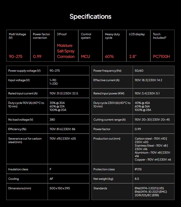 Multi input voltage The Cobra by Stealth Cut 45 PFC LCD Plasma Cutting Machine offers multiple advantages, including energy-saving technology for efficient operation and the flexibility to work with dual input voltages of 110V and 230V, making it adaptable to a wide range of working environments.