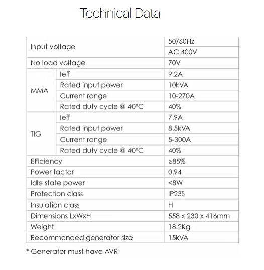 • MMA welding with Hot Start, Anti-Stick and Arc Force control