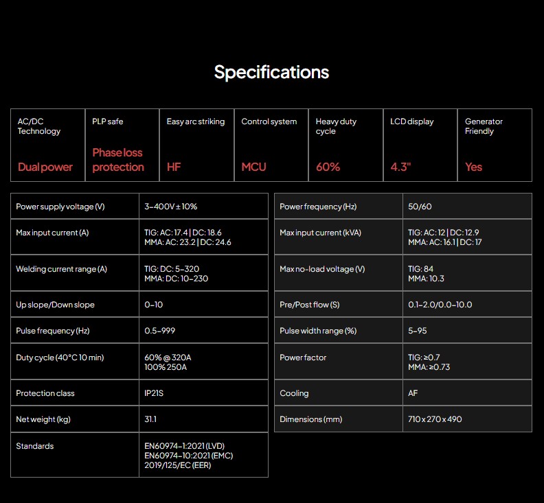 Increase the efficiency of your welding with the cobra by stealth 321 LCD AC/DC tig welding machine. This 3 phase machine utilises advanced ac/dc technology and features 3 main welding modes (TIG HF, TIG LIFT & MMA)