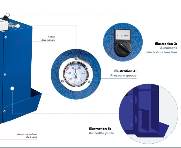 The units include a well-designed and effective self-cleaning function through the application of the integrated manual-rotating nozzle. The compressed air nozzle provides a uniform air-stream that cleans all filter segments. Cleaning is performed whilst in-situ, and is efficient, safe and quickly completed saving both time and money.
