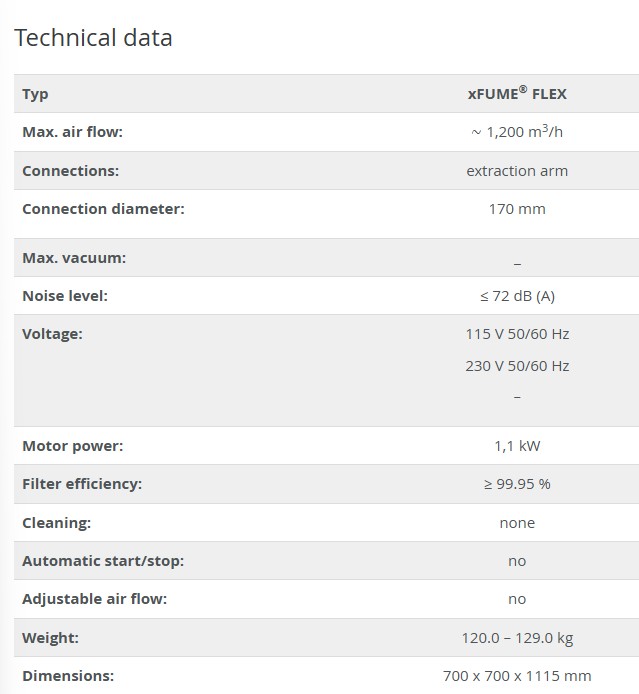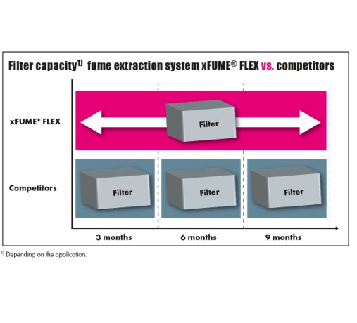 A device for capturing welding fumes must efficiently and reliably extract harmful fumes so that these do not enter the welder's respiratory tract. Ideally, all those working in the vicinity of the welder are also protected from exposure to welding fumes. The welding fume extraction system captures the welding fumes produced and directs them into the extraction system. A pre-filter and a main filter clean the fumes and release the clean air into the environment. Instead of a common carbon brush motor, the xFUME® FLEX is equipped with a brushless motor, which considerably extends the service life of the motor. A major advantage of the xFUME® FLEX is that the system not only extracts welding fumes from the ongoing process, but also any kind of micro-particles that are produced by cutting and grinding work, for example. Thus, the xFUME® FLEX is a true all-rounder in terms of extraction.